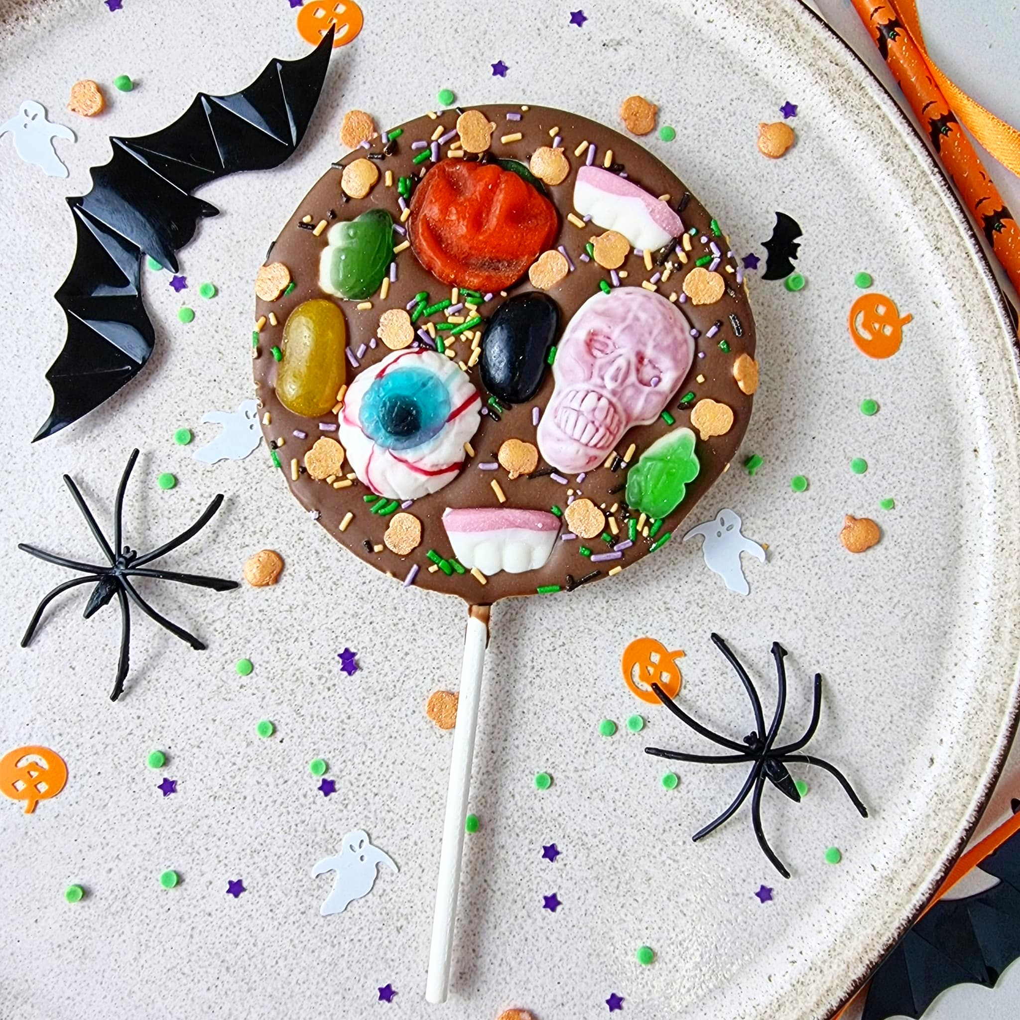 Pack of 3 GIANT Belgian milk chocolate lollipops, topped with spooky jelly sweets and Halloween sprinkles.
