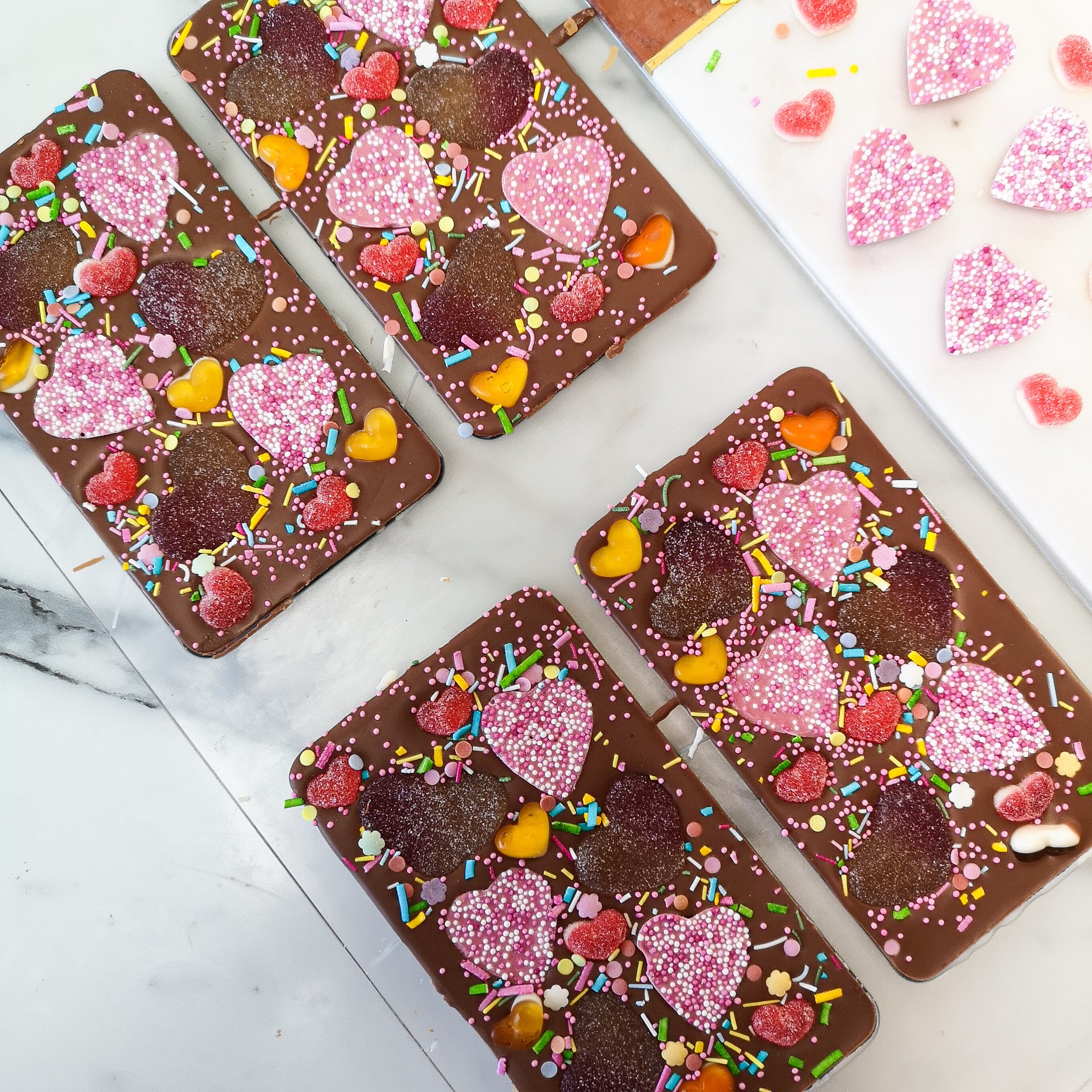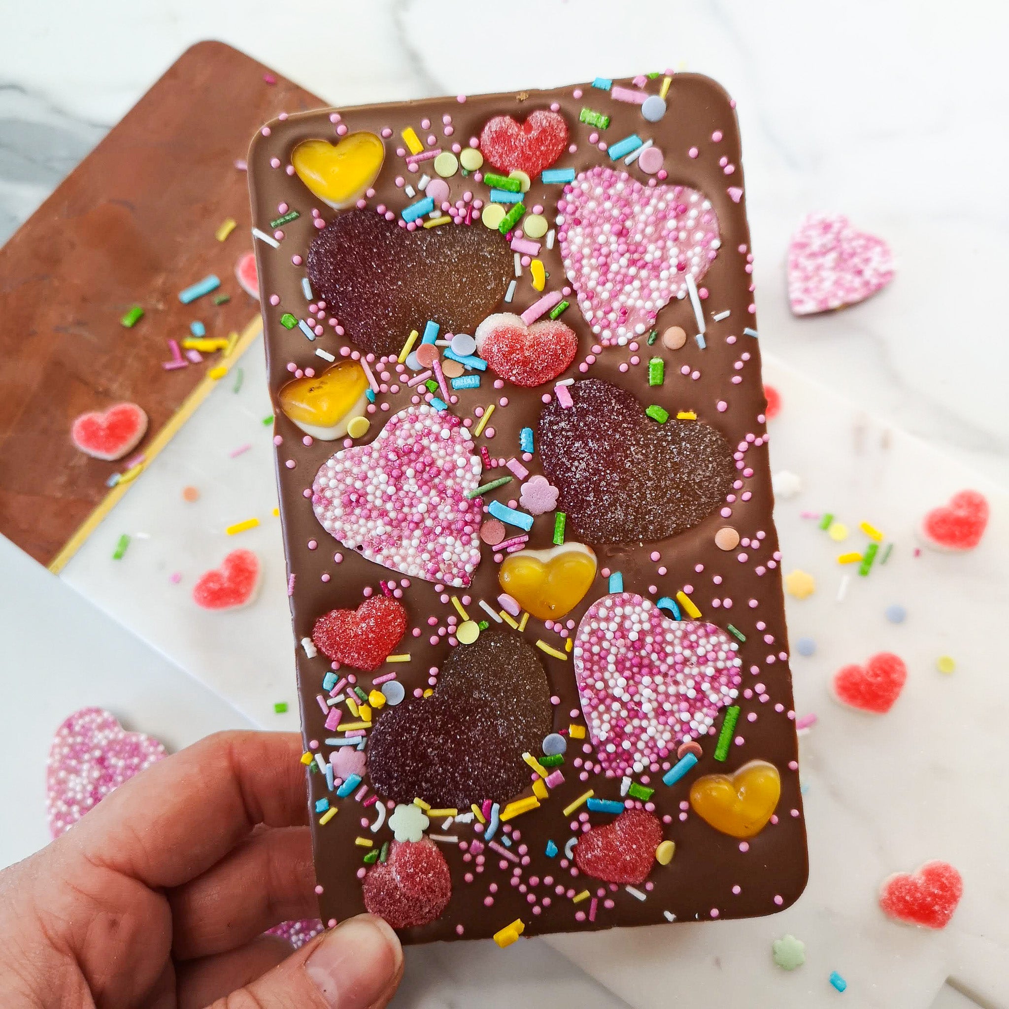 A fully loaded milk chocolate Slabb, topped with all your favourite heart shaped sweets! Including pink strawberry chocolate hearts, fizzy peach hearts, strawberry jelly hearts & mini fruit jelly hearts.