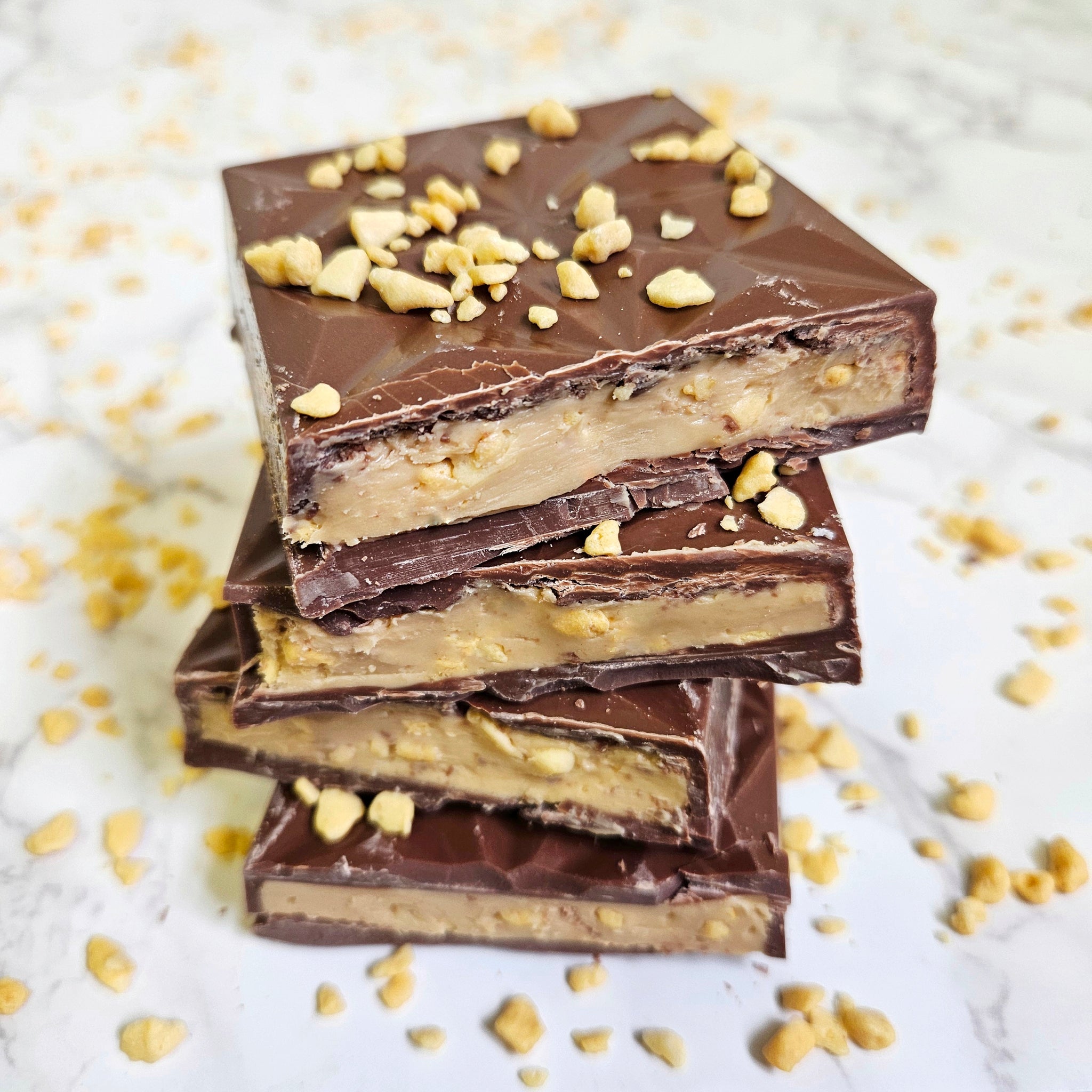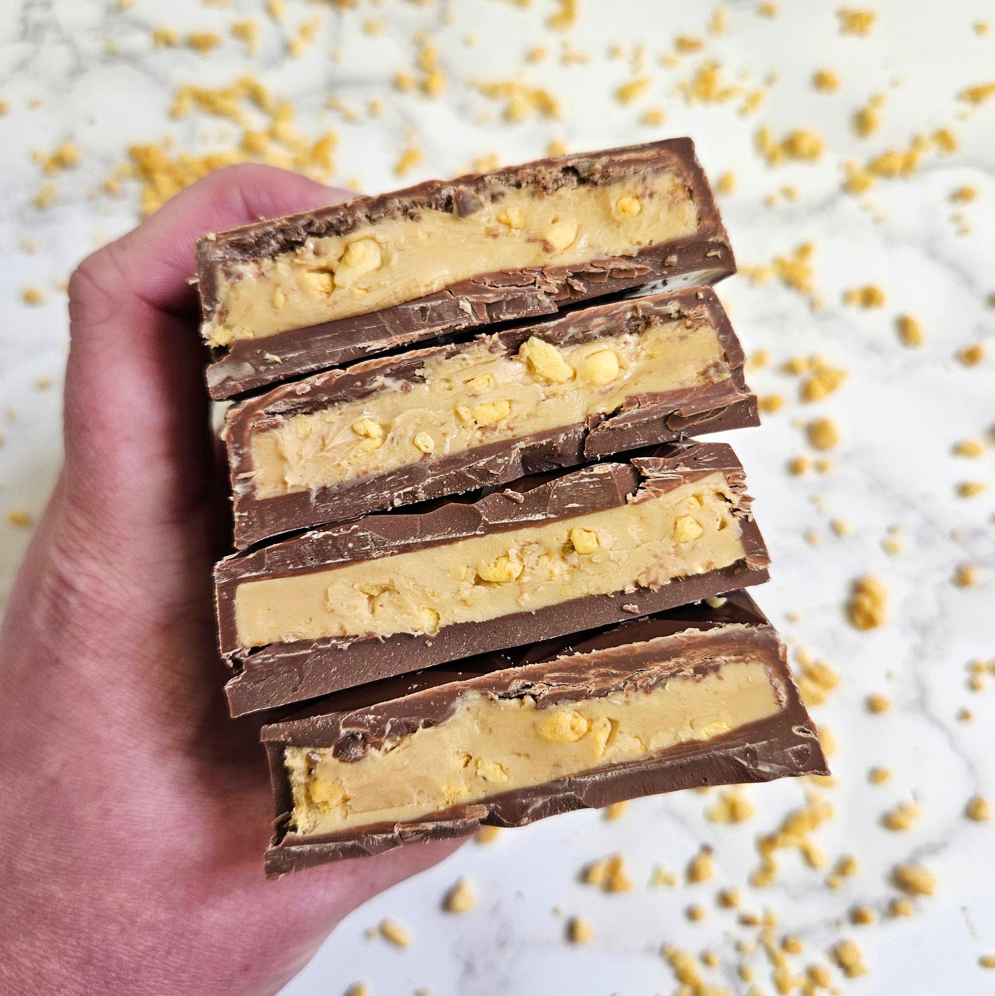 A smooth Belgian milk chocolate case stuffed with a thick, rich golden chocolate ganache, studded with mini honeycomb pieces. Heavenly.