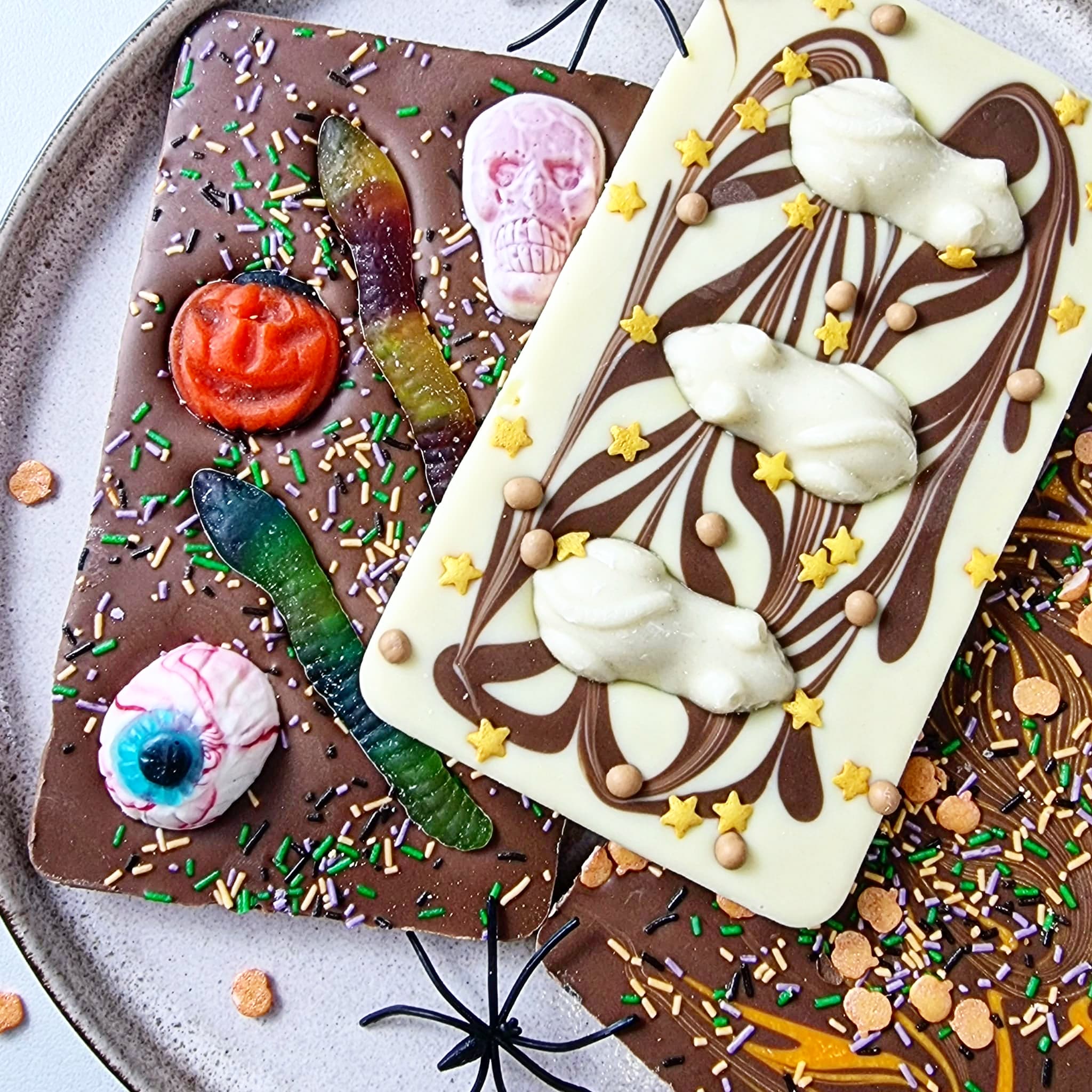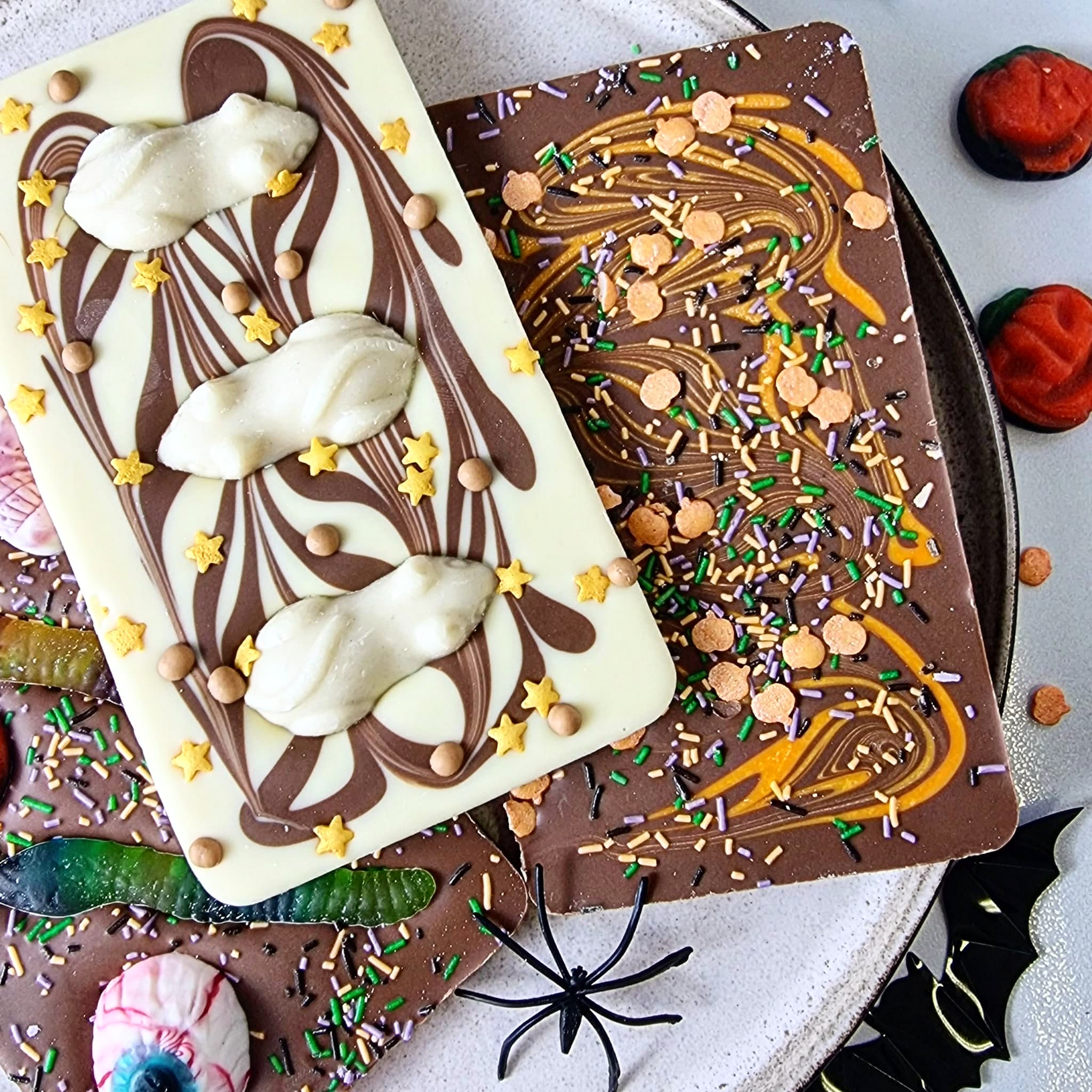 Smooth Belgian milk chocolate topped with spooky jelly sweets and Halloween sprinkles.