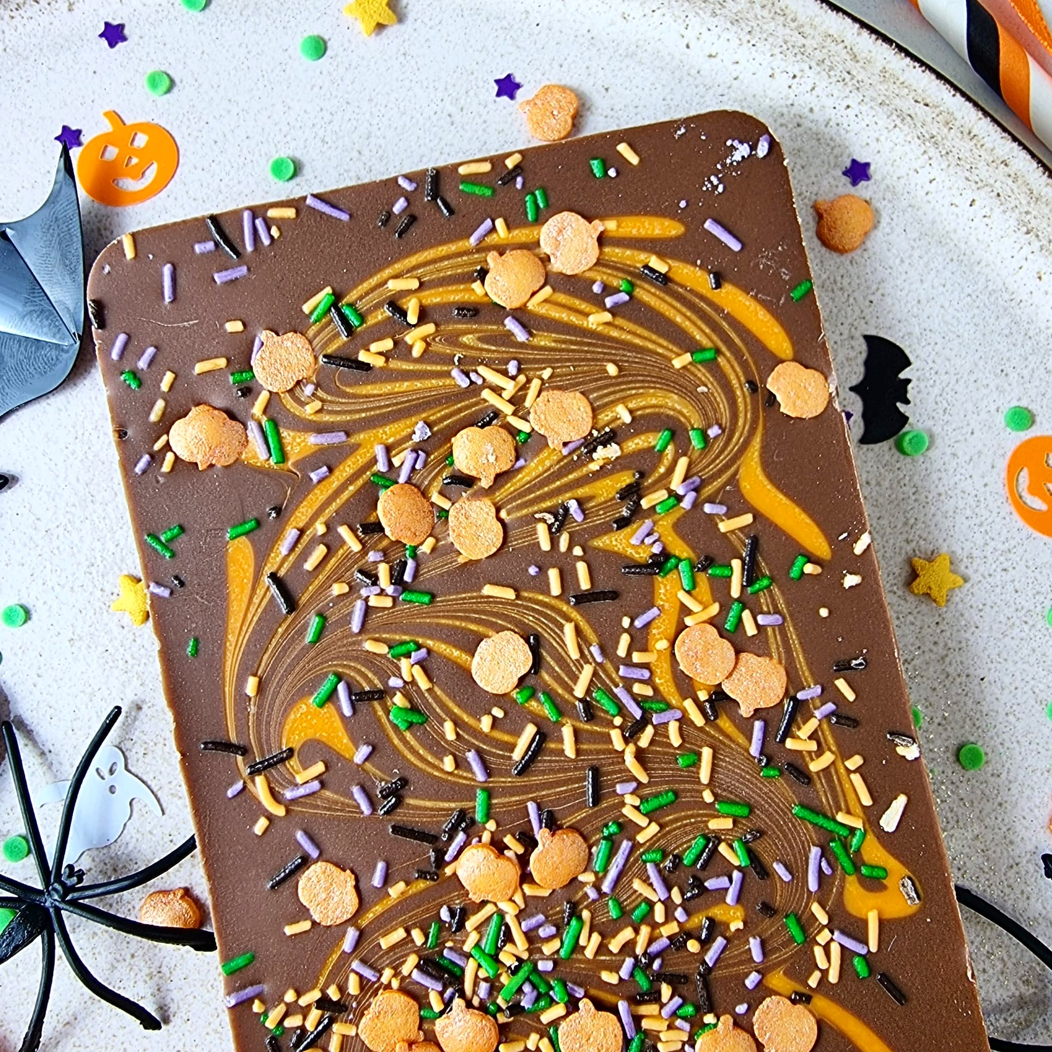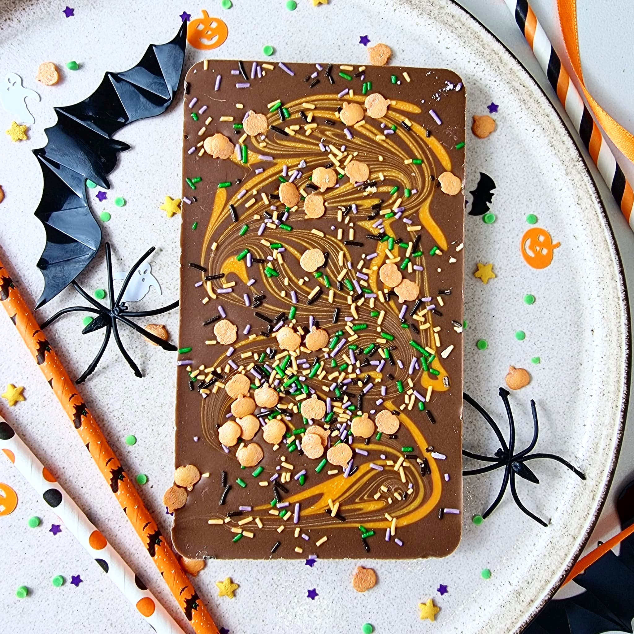 Smooth Belgian milk chocolate swirled with delicious orange flavoured chocolate and topped with spooky Halloween sprinkles!