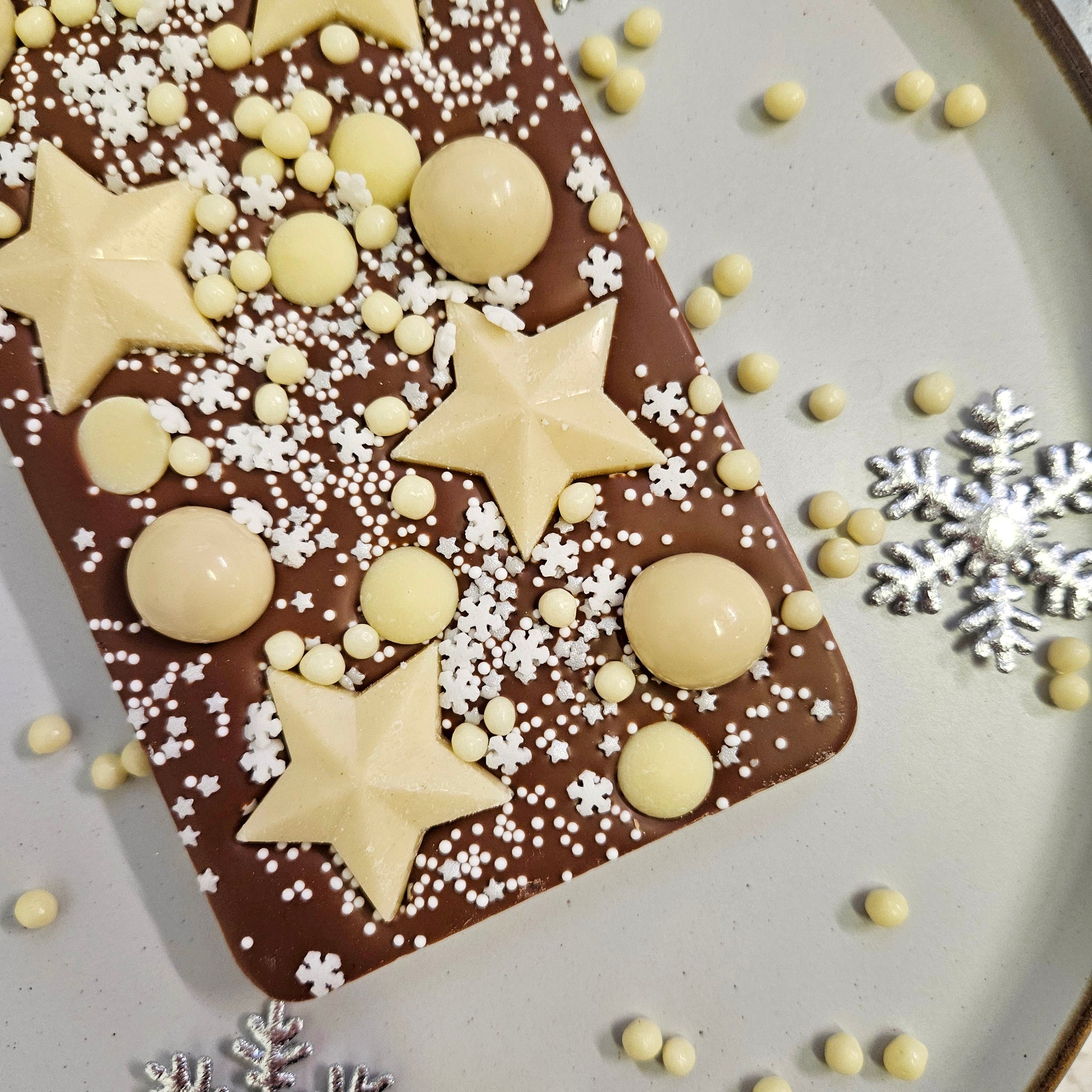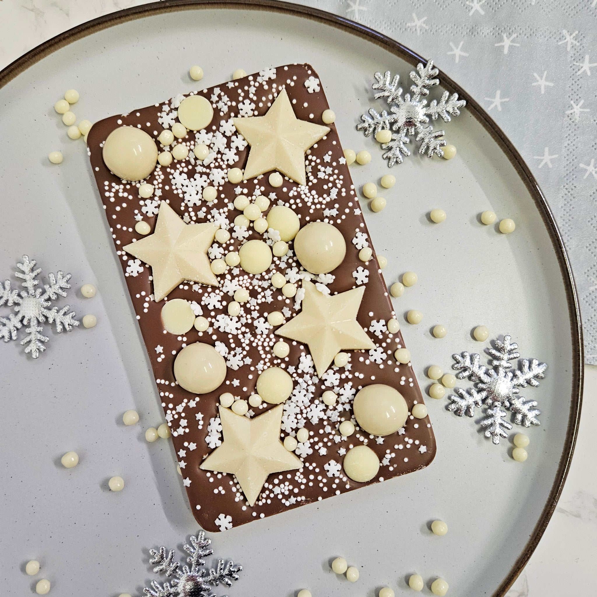 Milk Chocolate topped with white chocolate malt balls, mini white chocolate crisp pearls, white chocolate buttons, white chocolate stars and festive snowy sprinkles.