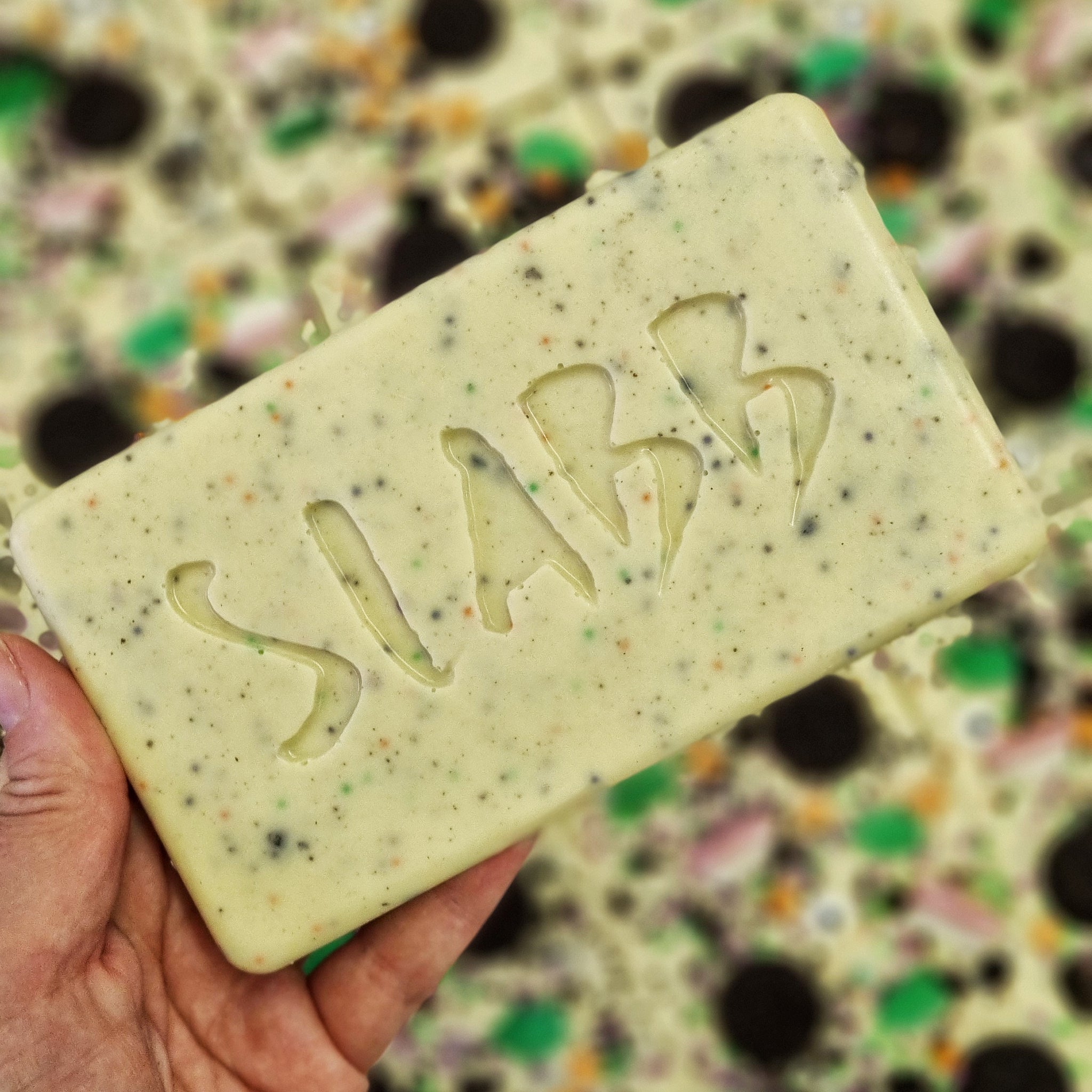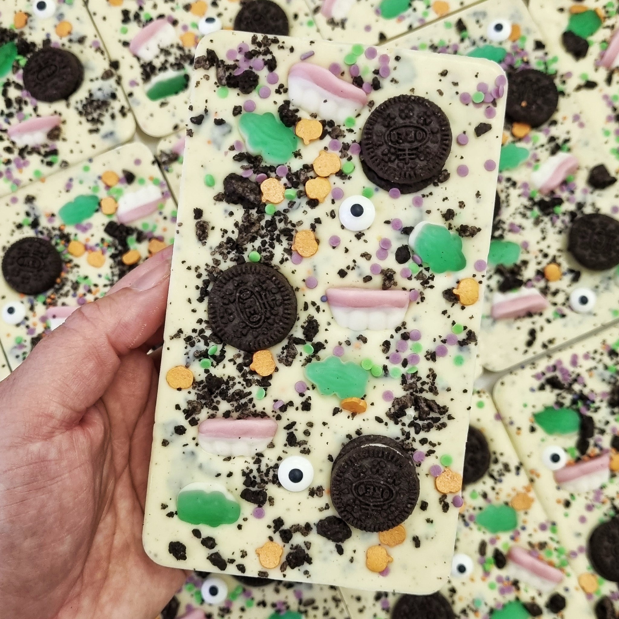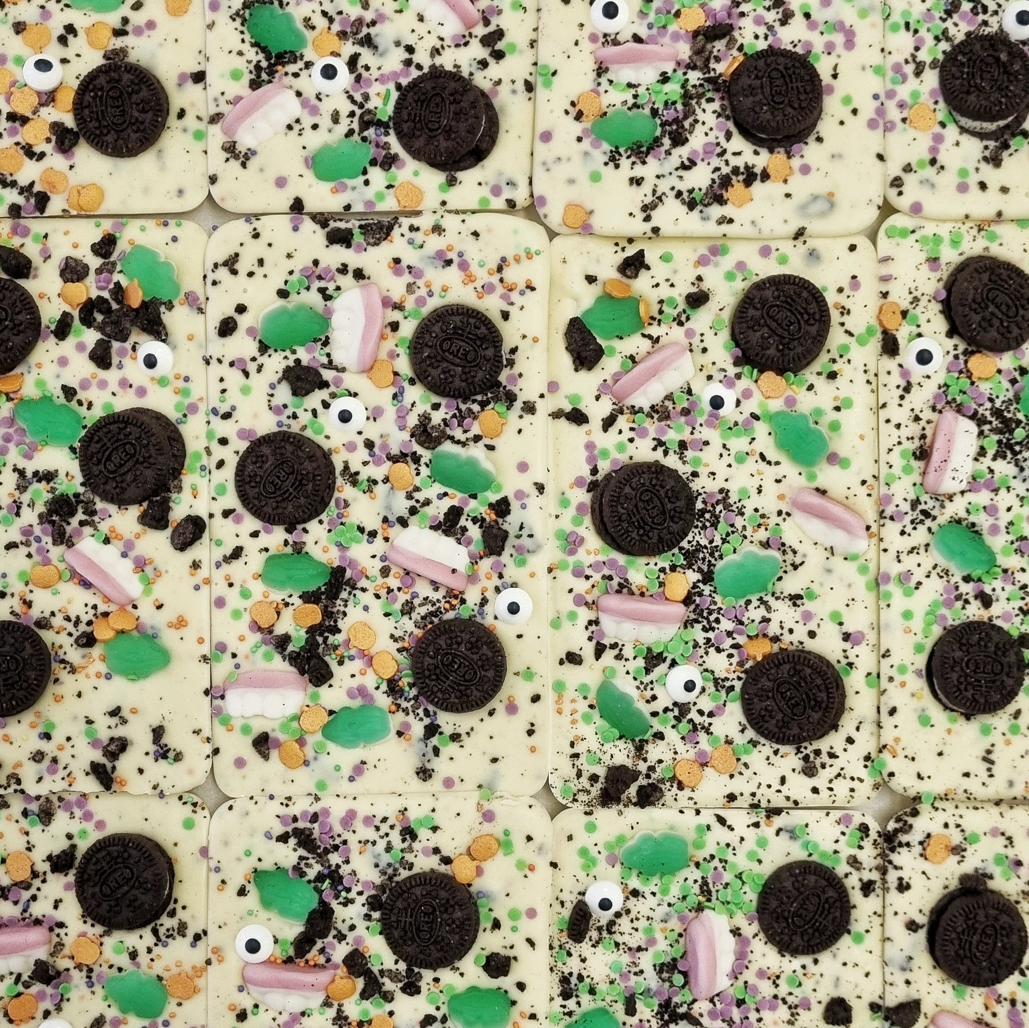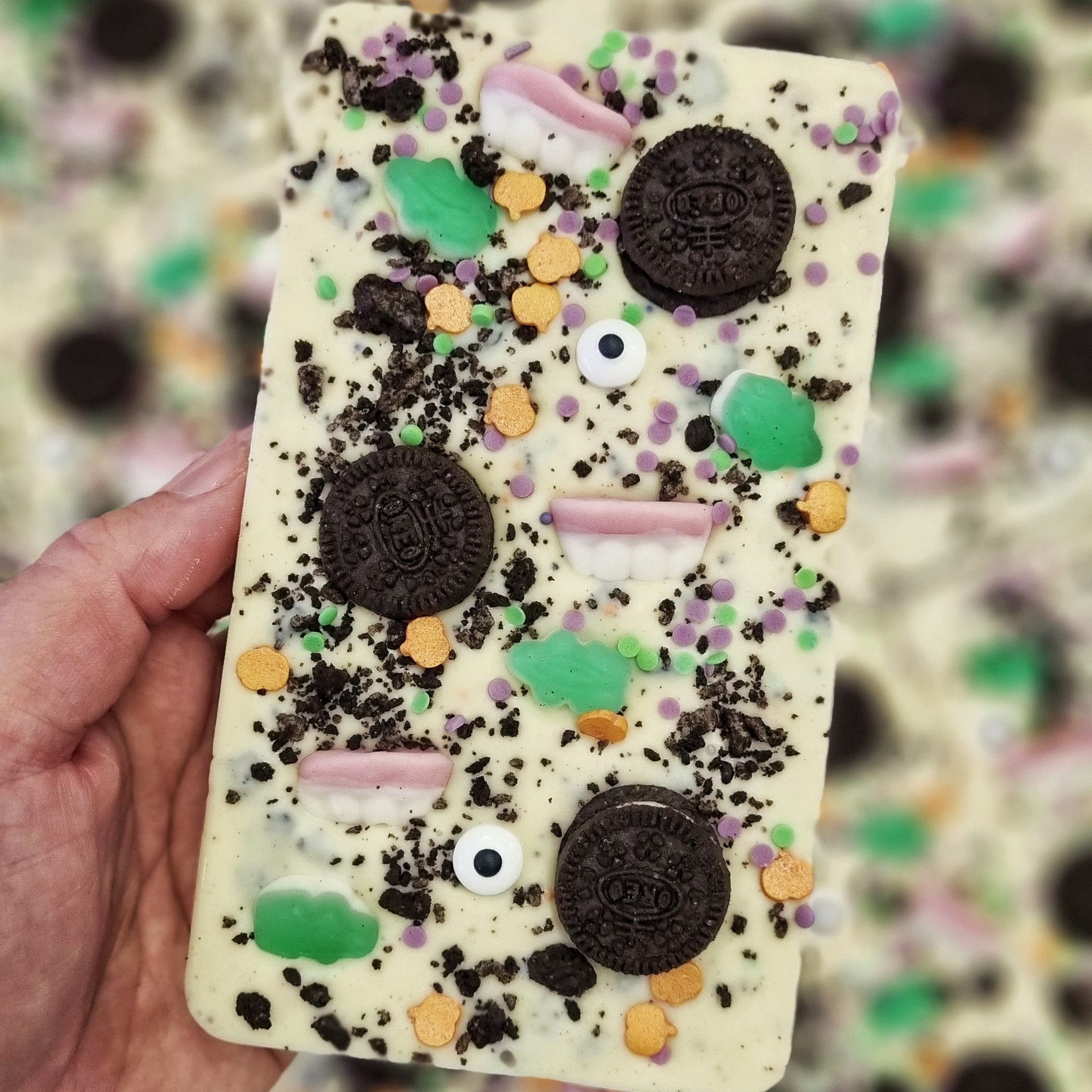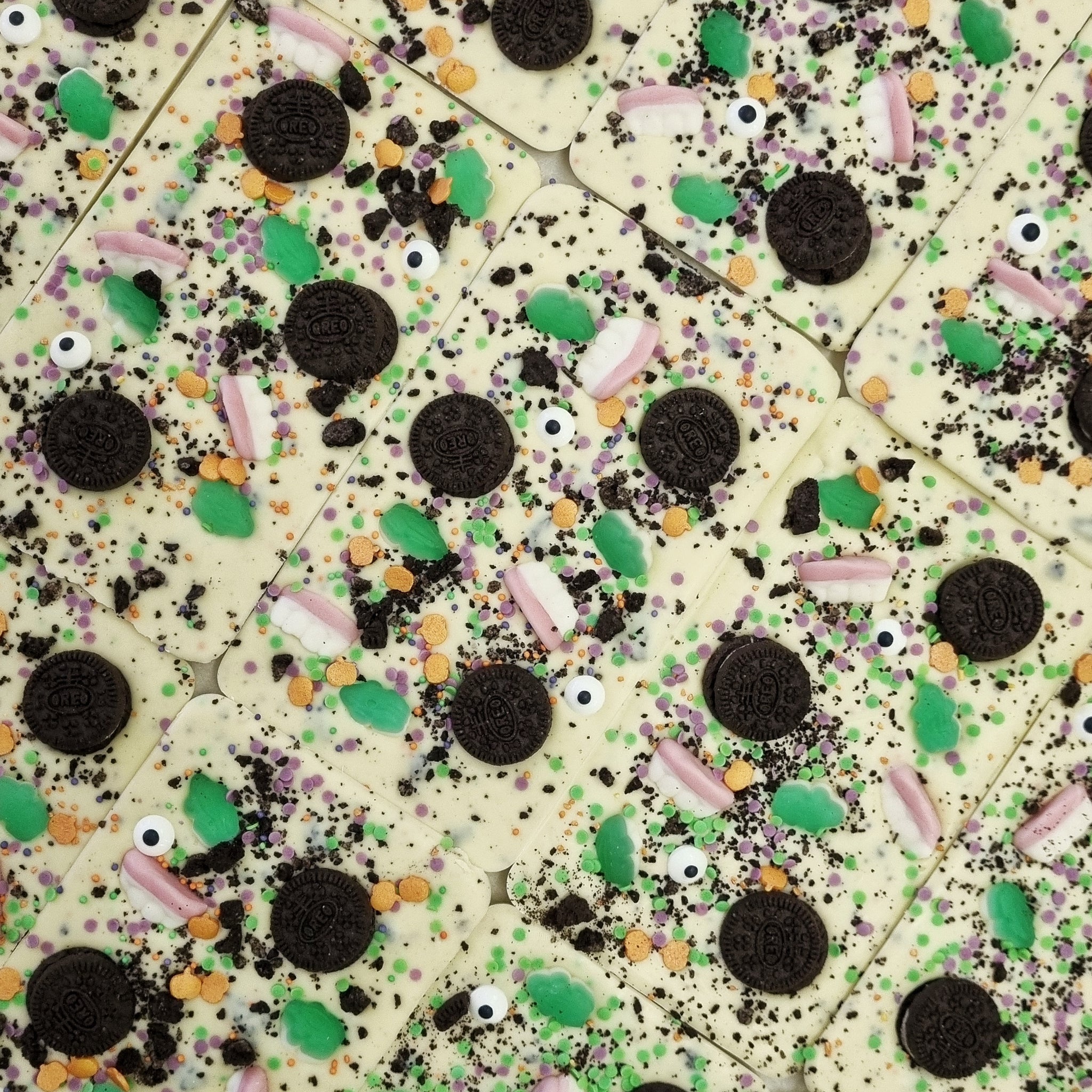 Belgian white chocolate filled with cookie crumb and Halloween sprinkles, topped with jelly frogs, gummy teeth, mini Oreos and spooky sprinkles.